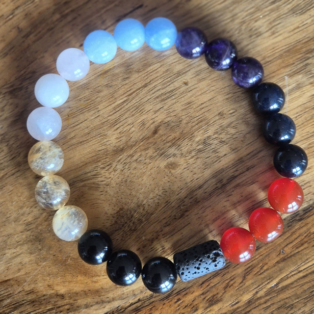 Seven Chakra Crystal Bracelet – Handmade Healing Jewellery with Obsidian, Carnelian, Citrine, Rose Quartz, Angelite, Iolite & Amethyst